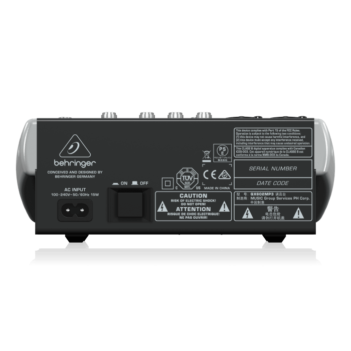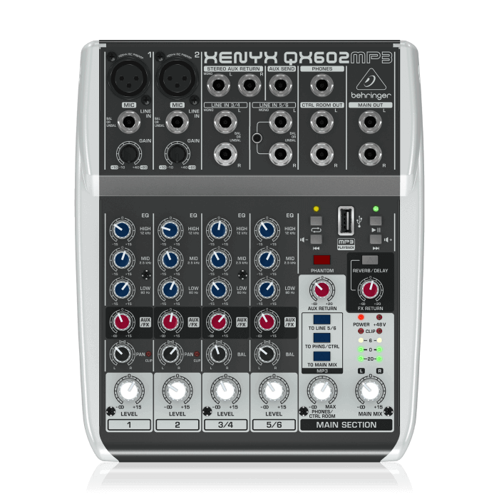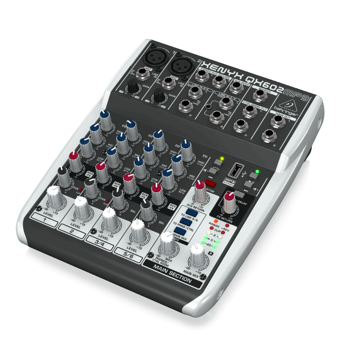 La consola QX602MP3 de Behringer es una mezcladora de audio de 6 canales con múltiples funciones, diseñada para su uso en aplicaciones de grabación, sonido en vivo y podcasting. Algunas de sus características principales son:
